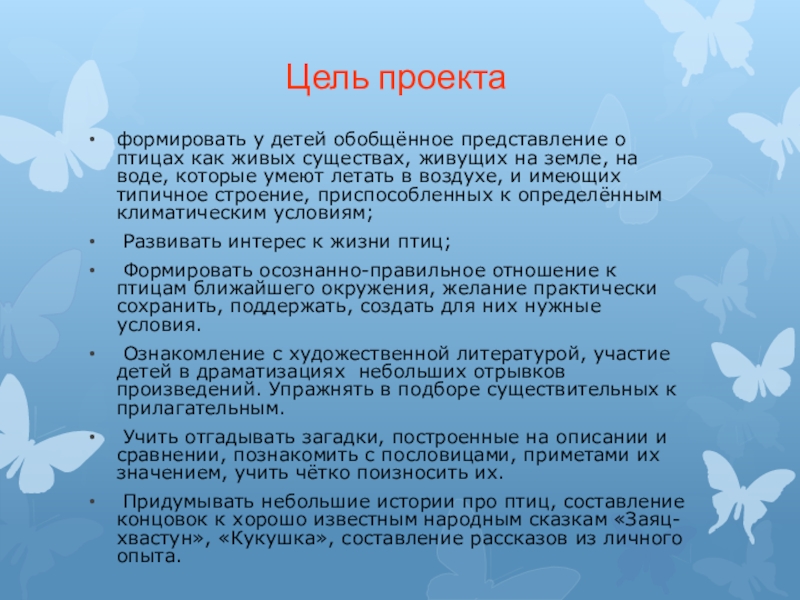 Цель проектаформировать у детей обобщённое представление о птицах как живых существах, живущих на земле, на воде, которые умеют летать в воздухе, и имеющих типичное строение, приспособленных к определённым климатическим условиям; Развивать интерес к жизни птиц; Формировать