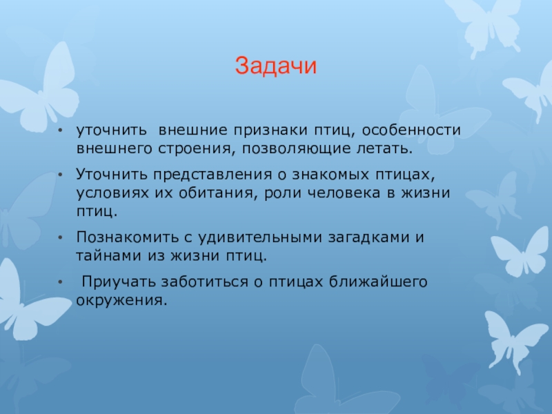 Задачи уточнить внешние признаки птиц, особенности внешнего строения, позволяющие летать.Уточнить представления о знакомых птицах, условиях их