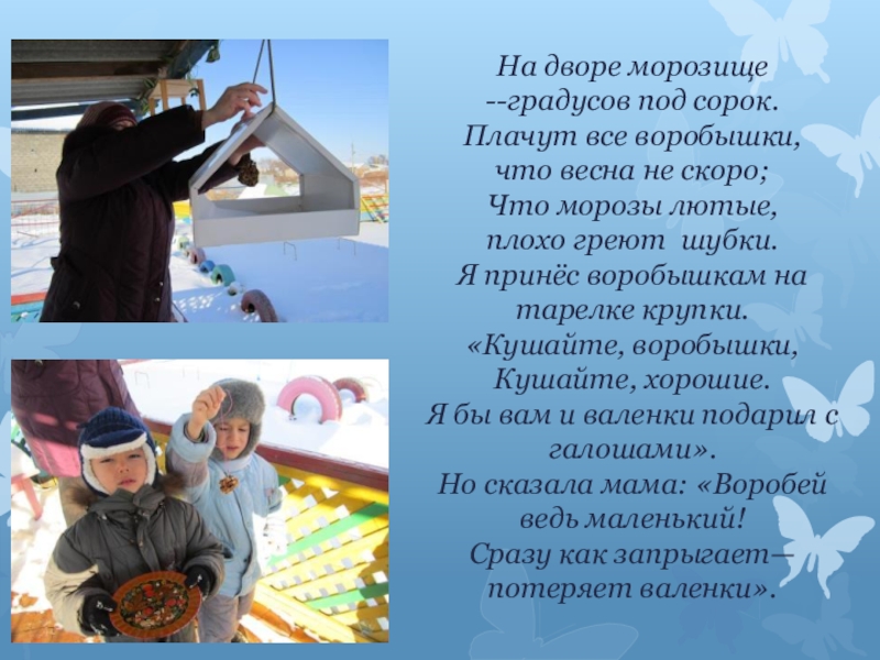 На дворе морозище--градусов под сорок.Плачут все воробышки,что весна не скоро;Что морозы лютые,плохо греют шубки.Я принёс воробышкам на