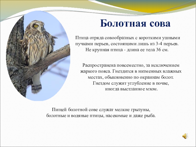 Пищей болотной сове служат мелкие грызуны, болотные и водяные птицы, насекомые и даже рыба.