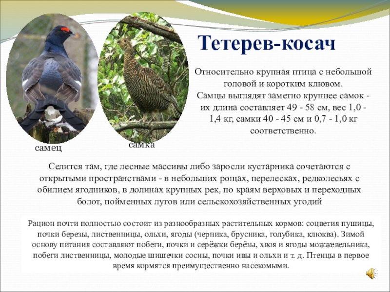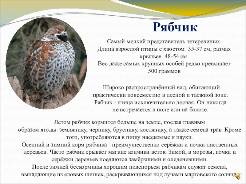 Осенний и зимний корм рябчика - преимущественно серёжки и почки лиственных деревьев. Часто рябчик срывает мягкие кончики веток. Зимой, в морозы, почки и серёжки деревьев поедаются замёрзшими и оледеневшими.