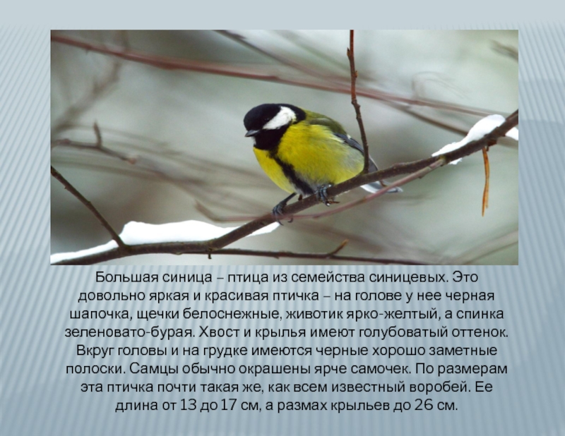 Слайд 14Большая синица – птица из семейства синицевых. Это довольно яркая и