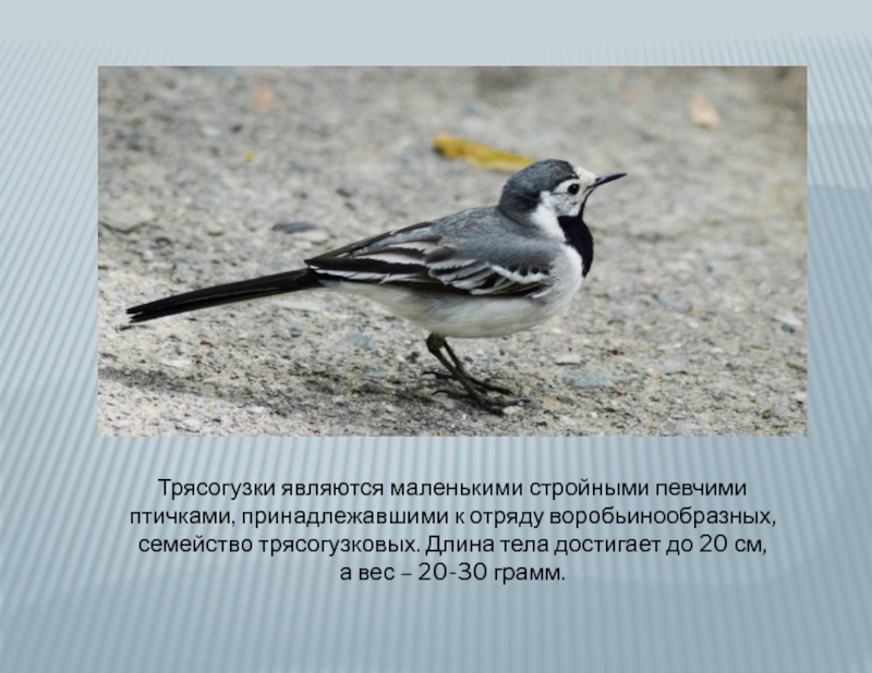 Слайд 10Трясогузки являются маленькими стройными певчими птичками, принадлежавшими к отряду воробьинообразных, семейство