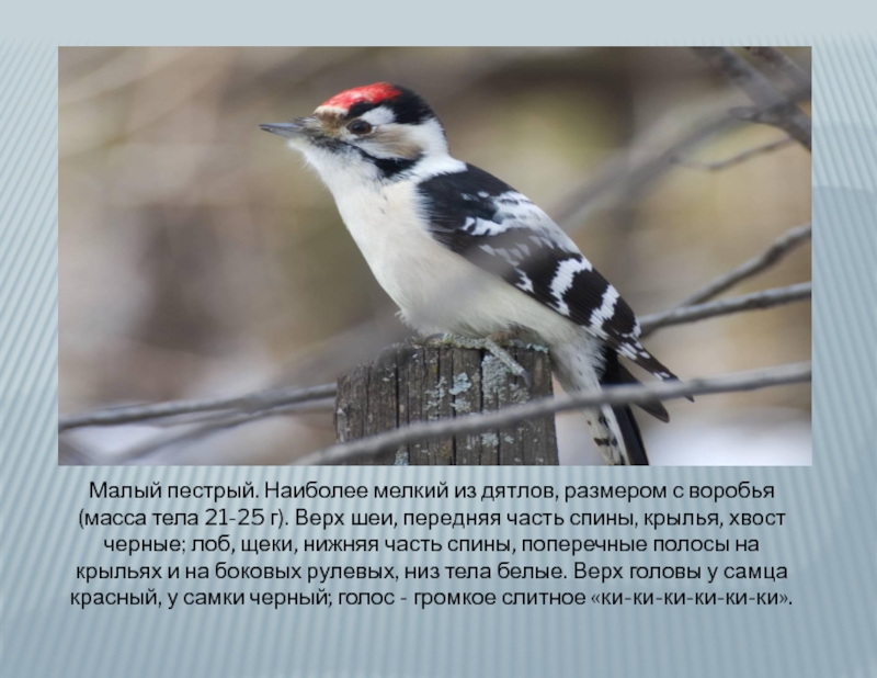 Слайд 11Малый пестрый. Наиболее мелкий из дятлов, размером с воробья (масса тела