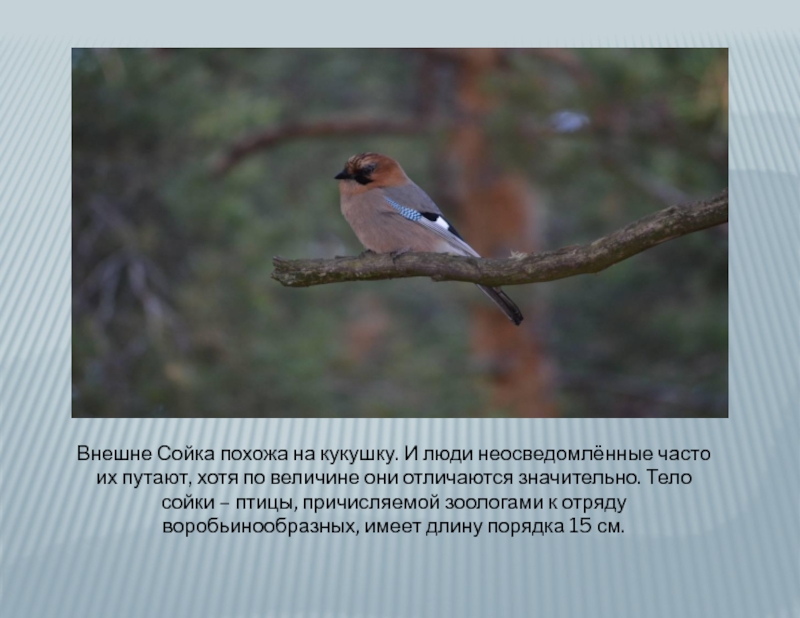 Слайд 9Внешне Сойка похожа на кукушку. И люди неосведомлённые часто их путают,