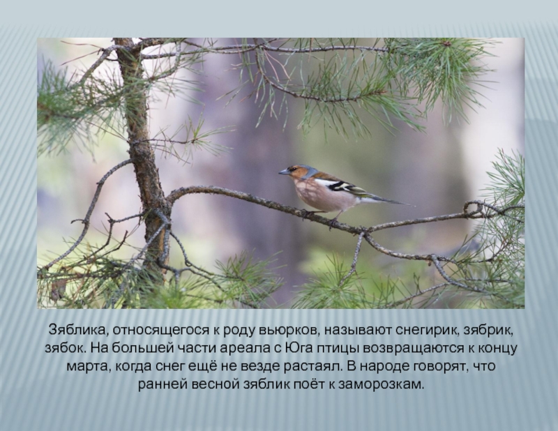 Слайд 4Зяблика, относящегося к роду вьюрков, называют снегирик, зябрик, зябок. На большей