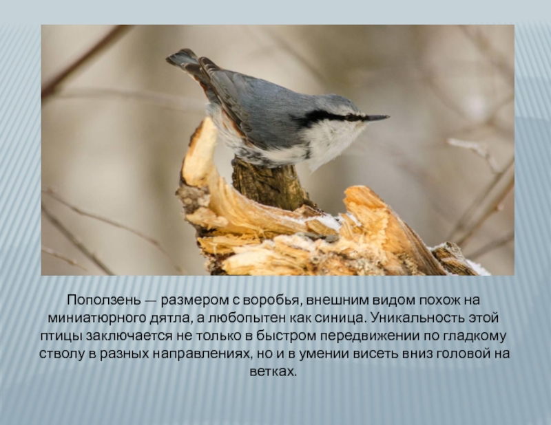 Слайд 3Поползень — размером с воробья, внешним видом похож на миниатюрного дятла,