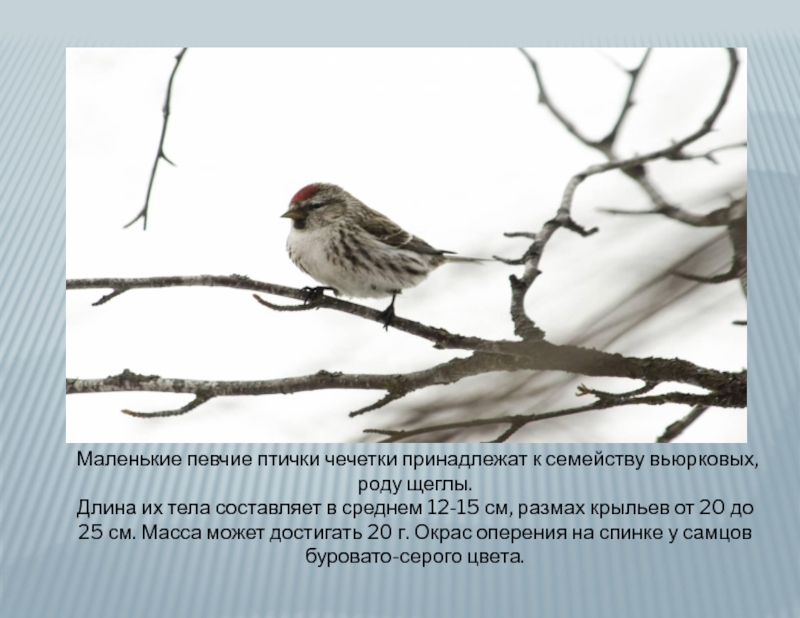 Слайд 6Маленькие певчие птички чечетки принадлежат к семейству вьюрковых, роду щеглы.