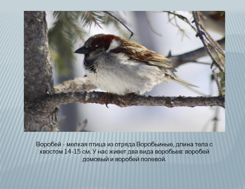 Слайд 7Воробей - мелкая птица из отряда Воробьиные, длина тела с хвостом