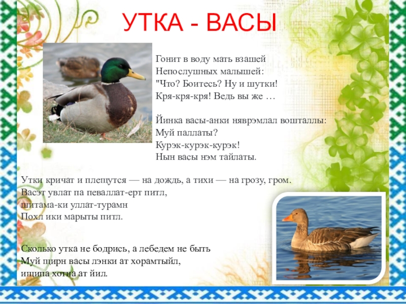 Утки кричат и плещутся — на дождь, а тихи — на грозу, гром.