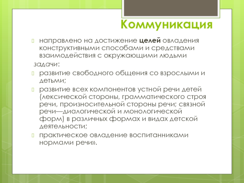 развитие всех компонентов устной речи детей (лексической стороны, грамматического строя речи, произносительной стороны речи; связной речи—диалогической и монологической форм) в различных формах и видах детской деятельности;