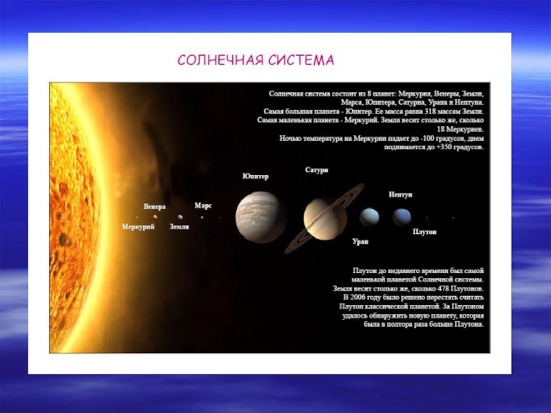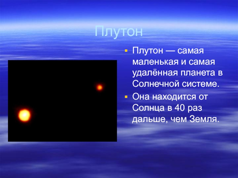 ПлутонПлутон — самая маленькая и самая удалённая планета в Солнечной системе. Она находится от Солнца в 40