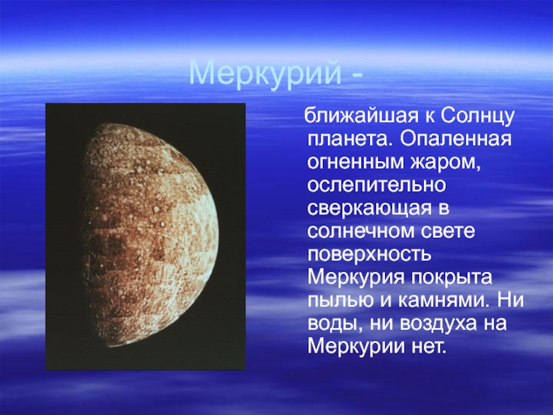 Меркурий - ближайшая к Солнцу планета. Опаленная огненным жаром, ослепительно сверкающая в солнечном свете поверхность Меркурия покрыта пылью и камнями. Ни воды, ни воздуха на Меркурии нет.