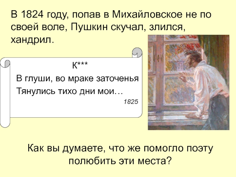 В 1824 году, попав в Михайловское не по своей воле, Пушкин скучал, злился, хандрил.