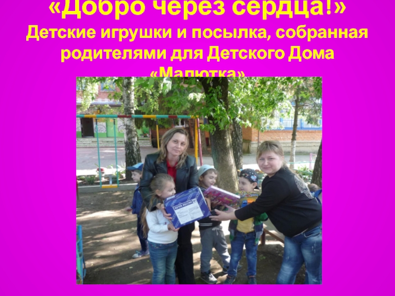 Слайд 20«Добро через сердца!» Детские игрушки и посылка, собранная родителями для Детского Дома