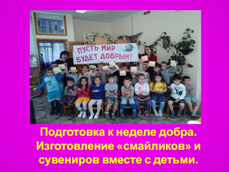 Слайд 3Подготовка к неделе добра. Изготовление «смайликов» и сувениров вместе с детьми.