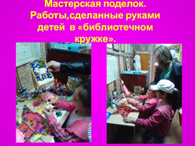Слайд 16Мастерская поделок. Работы,сделанные руками детей в «библиотечном кружке».
