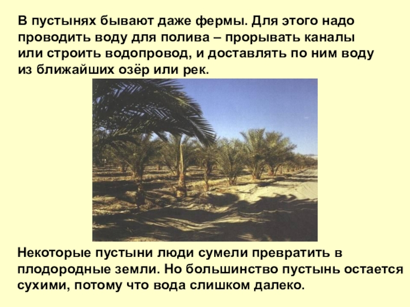 Некоторые пустыни люди сумели превратить в плодородные земли. Но большинство пустынь остается сухими, потому что вода слишком далеко.