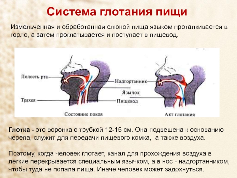 Поэтому, когда человек глотает, канал для прохождения воздуха в легкие перекрывается специальным язычком, а в нос - надгортанником, чтобы туда не попала пища. Иначе человек может задохнуться.