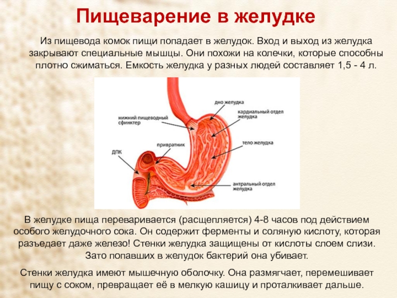 Из пищевода комок пищи попадает в желудок. Вход и выход из желудка закрывают специальные мышцы. Они похожи на колечки, которые способны плотно сжиматься. Емкость желудка у разных людей составляет 1,5 - 4 л.