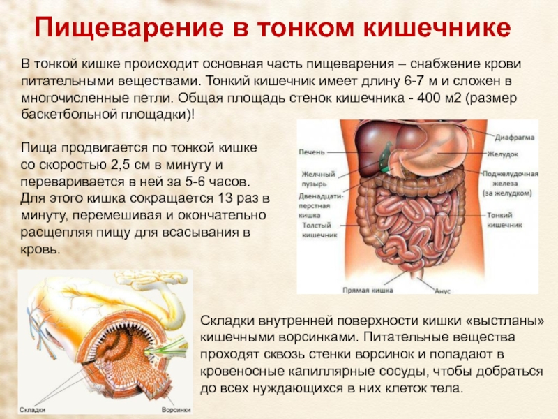 Пища продвигается по тонкой кишке со скоростью 2,5 см в минуту и переваривается в ней за 5-6 часов. Для этого кишка сокращается 13 раз в минуту, перемешивая и окончательно расщепляя пищу для всасывания в кровь.