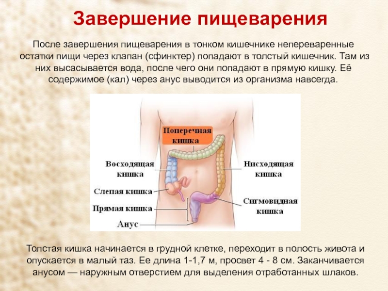 Толстая кишка начинается в грудной клетке, переходит в полость живота и опускается в малый таз. Ее длина 1-1,7 м, просвет 4 - 8 см. Заканчивается анусом — наружным отверстием для выделения отработанных шлаков.