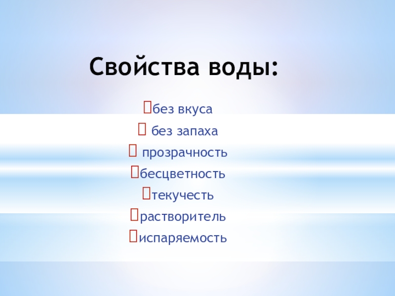 Свойства воды:без вкуса без запаха прозрачность бесцветностьтекучестьрастворительиспаряемость