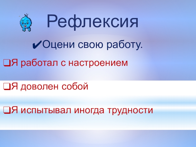 РефлексияОцени свою работу.Я работал с настроениемЯ доволен собойЯ испытывал иногда трудности