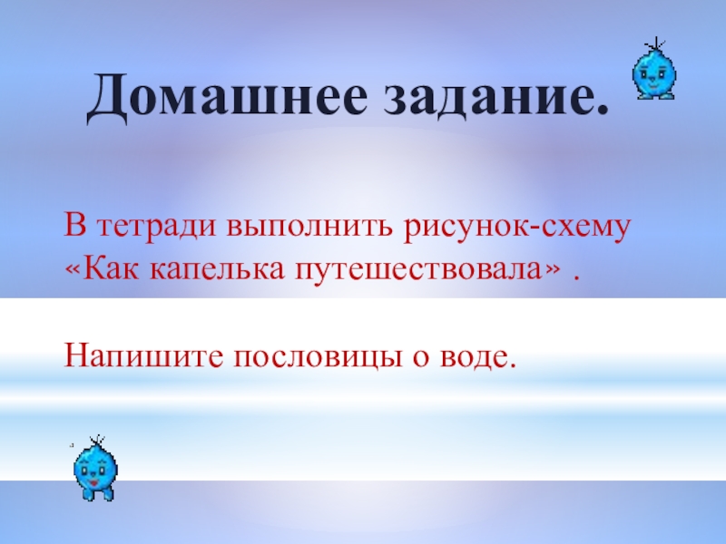 Домашнее задание.В тетради выполнить рисунок-схему «Как капелька путешествовала» .Напишите пословицы о воде.