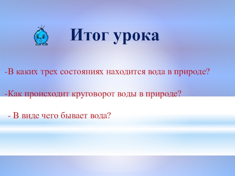 Итог урокаВ каких трех состояниях находится вода в природе? Как происходит круговорот воды в природе?- В виде