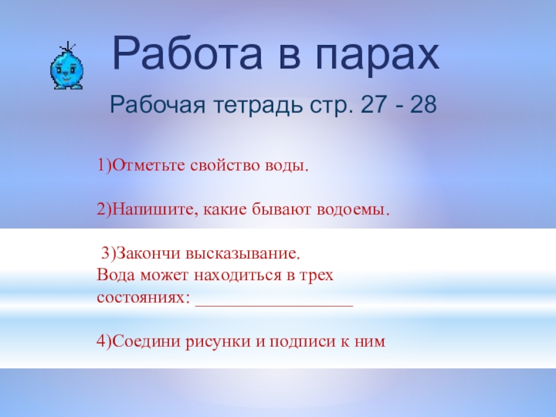 Работа в парахРабочая тетрадь стр. 27 - 281)Отметьте свойство воды.2)Напишите, какие бывают водоемы. 3)Закончи высказывание. Вода может