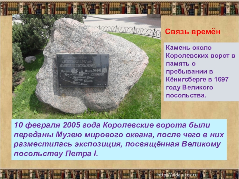 10 февраля 2005 года Королевские ворота были переданы Музею мирового океана, после чего в них разместилась экспозиция, посвящённая Великому посольству Петра I.