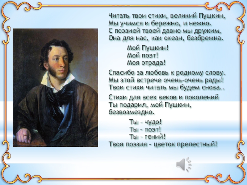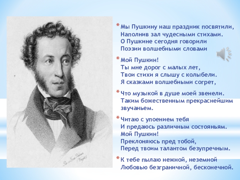 Слайд 7Имя А. С. Пушкина, черты его лица мы знаем с самого