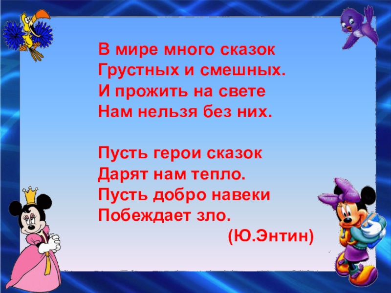 В мире много сказокГрустных и смешных.И прожить на светеНам нельзя без них.Пусть герои сказокДарят нам тепло.Пусть добро навекиПобеждает зло. (Ю.Энтин)