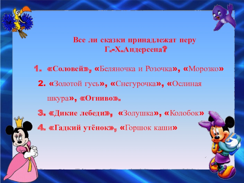 Все ли сказки принадлежат перу Г.-Х.Андерсена?«Соловей», «Беляночка и Розочка», «Морозко» 2. «Золотой гусь», «Снегурочка», «Ослиная шкура», «Огниво».