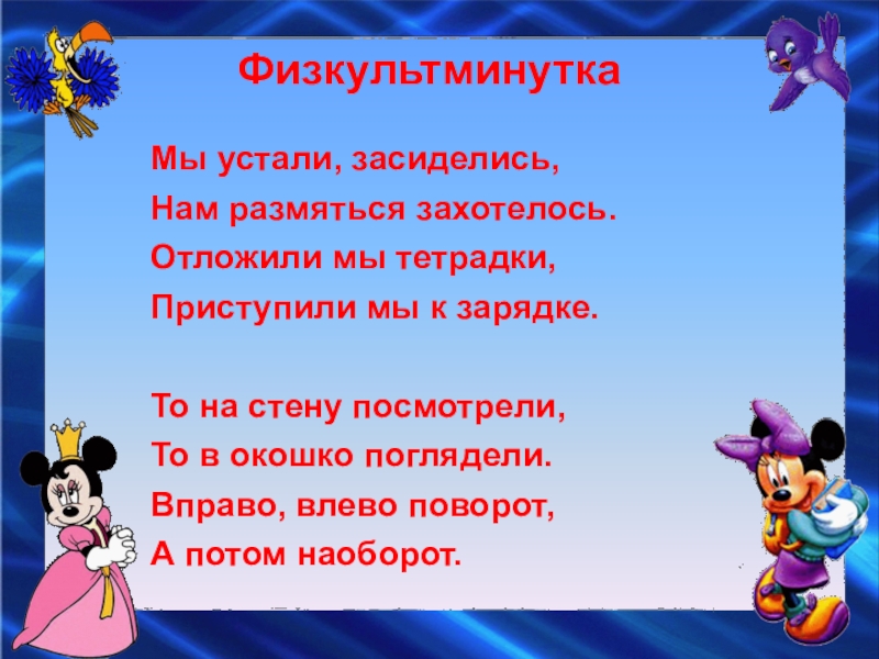 ФизкультминуткаМы устали, засиделись,Нам размяться захотелось.Отложили мы тетрадки,Приступили мы к зарядке.То на стену посмотрели,То в окошко поглядели.Вправо, влево