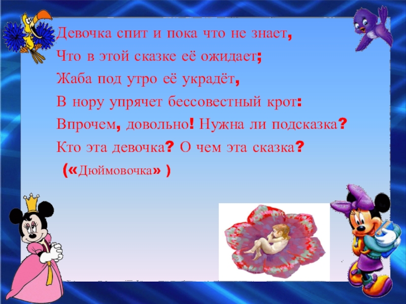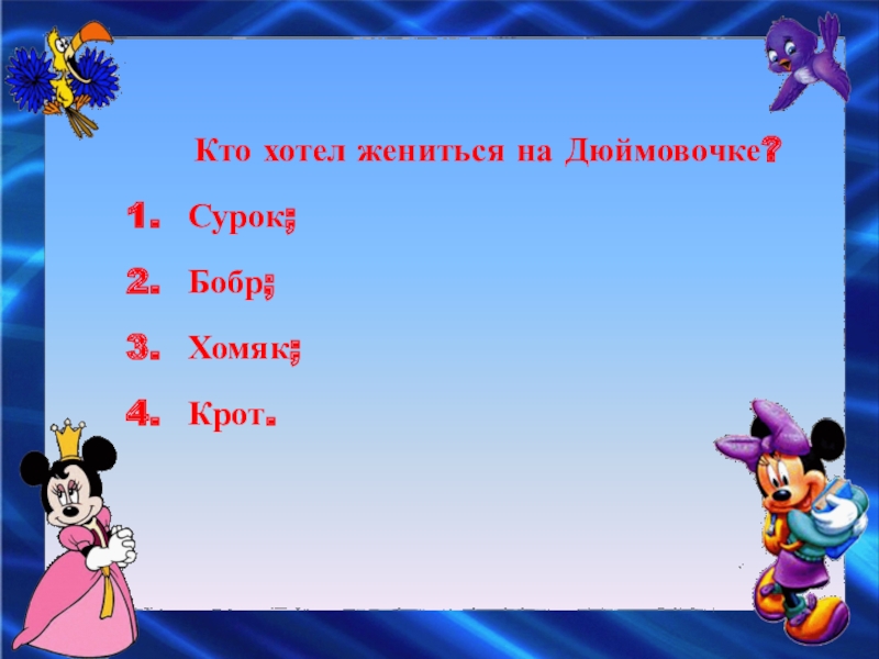 Кто хотел жениться на Дюймовочке? Сурок; Бобр; Хомяк; Крот.
