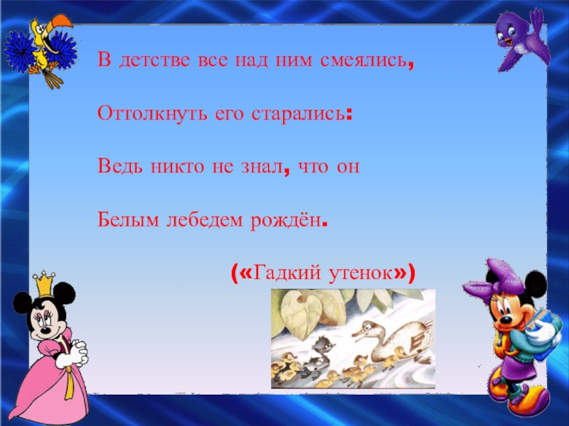 В детстве все над ним смеялись,Оттолкнуть его старались:Ведь никто не знал, что онБелым лебедем рождён.