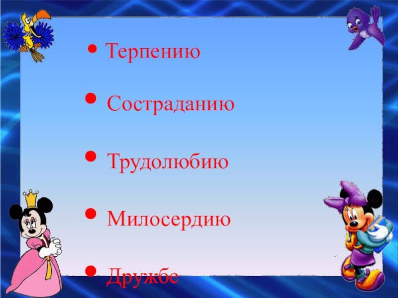 Терпению Состраданию Трудолюбию Милосердию Дружбе Любви