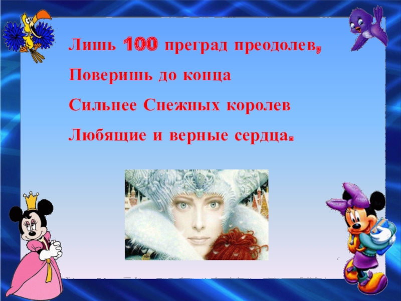 Лишь 100 преград преодолев,Поверишь до концаСильнее Снежных королевЛюбящие и верные сердца.