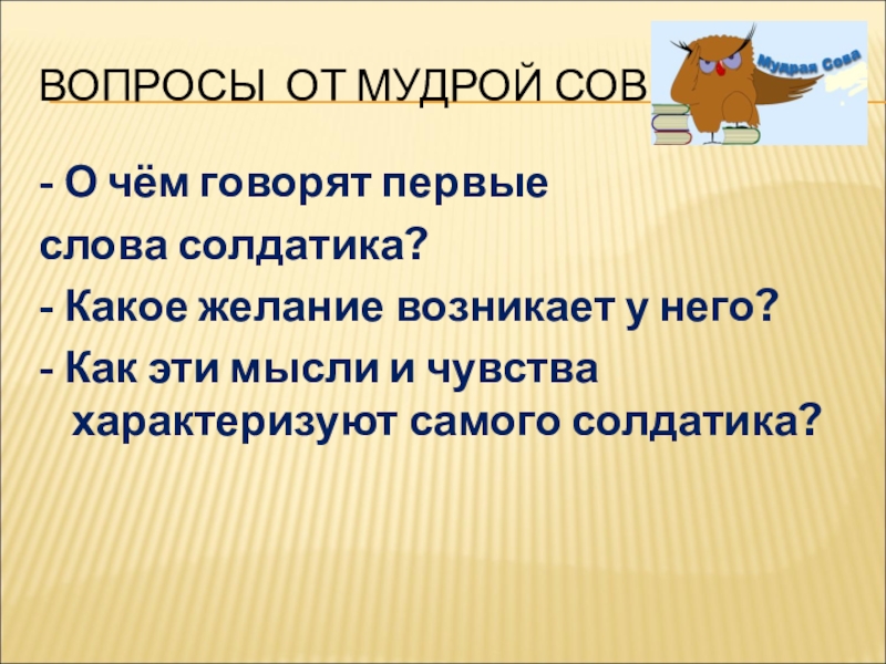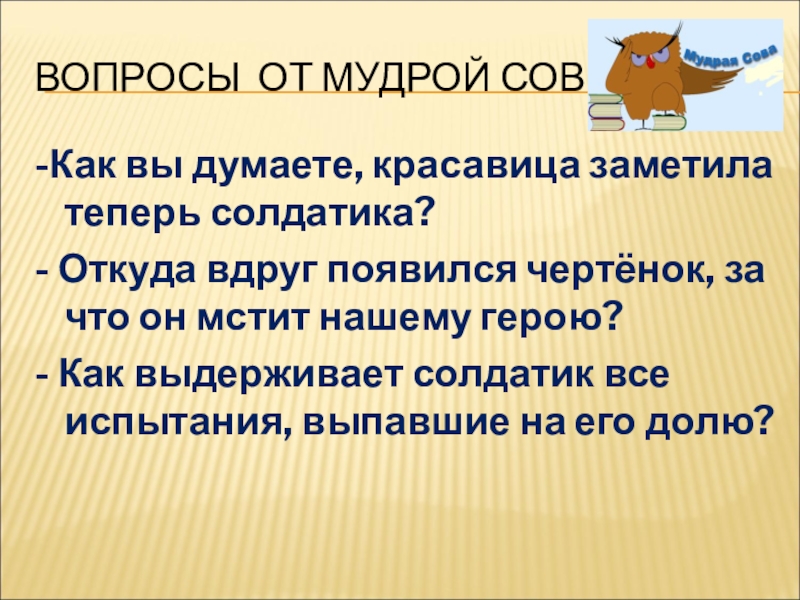 Слайд 28ВОПРОСЫ ОТ МУДРОЙ СОВЫ