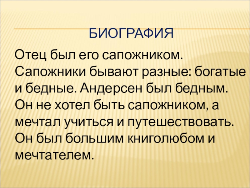 бедные. Андерсен был бедным. Он не хотел быть сапожником, а мечтал учиться и путешествовать. Он был большим книголюбом и мечтателем.