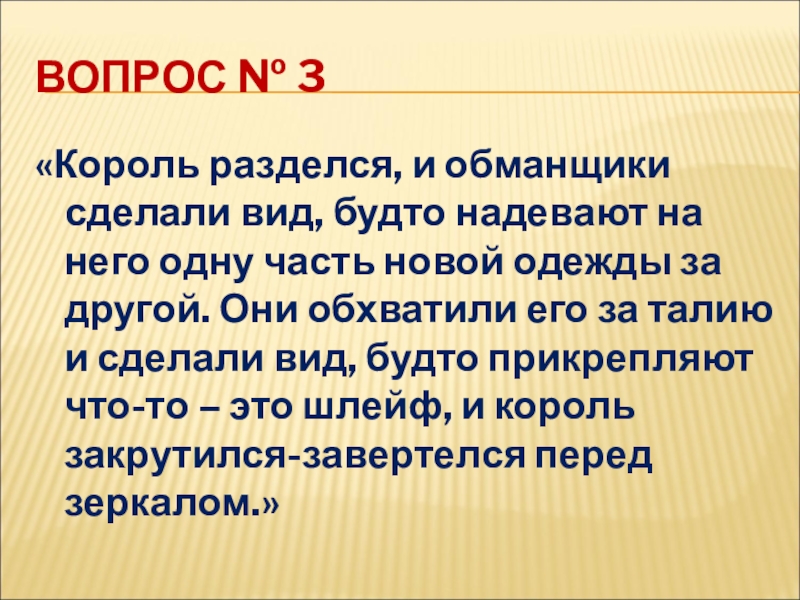 него одну часть новой одежды за другой. Они обхватили его за талию и сделали вид, будто прикрепляют что-то – это шлейф, и король закрутился-завертелся перед зеркалом.»