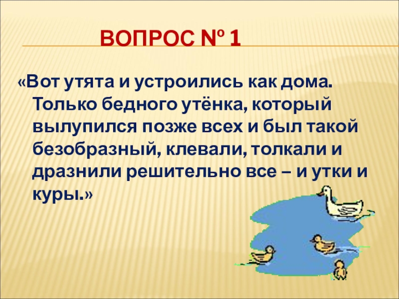 «Вот утята и устроились как дома. Только бедного утёнка, который вылупился позже всех и был такой безобразный, клевали, толкали и дразнили решительно все – и утки и куры.»
