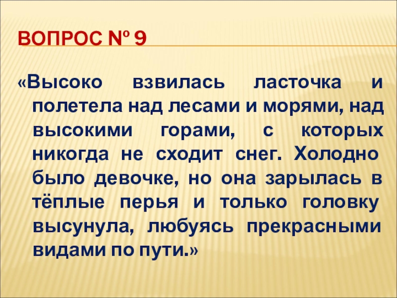 над высокими горами, с которых никогда не сходит снег. Холодно было девочке, но она зарылась в тёплые перья и только головку высунула, любуясь прекрасными видами по пути.»