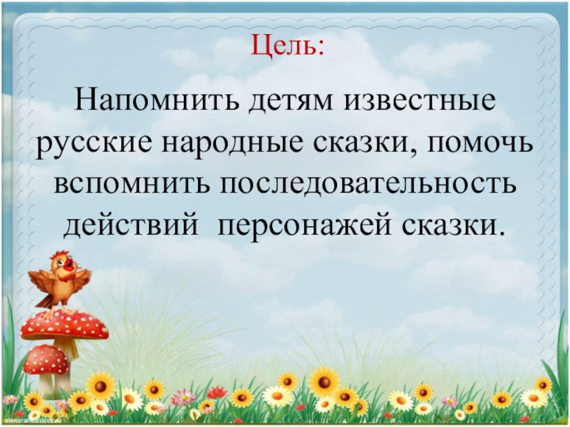 Цель:Напомнить детям известные русские народные сказки, помочь вспомнить последовательность действий персонажей сказки.