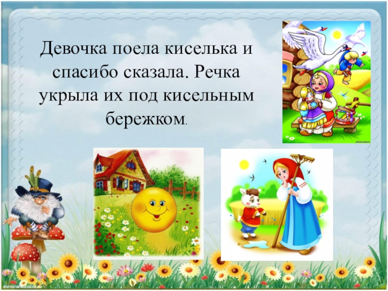 Слайд 9Девочка поела киселька и спасибо сказала. Речка укрыла их под кисельным