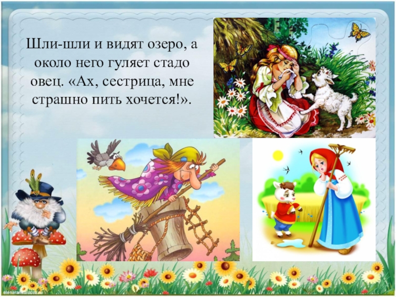 Шли-шли и видят озеро, а около него гуляет стадо овец. «Ах, сестрица, мне страшно пить хочется!».