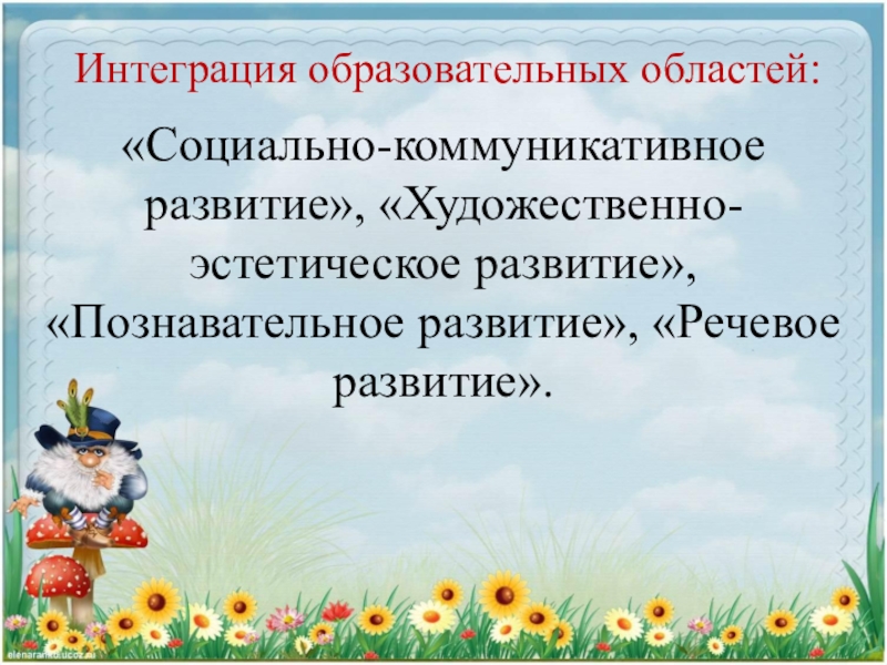 Интеграция образовательных областей:«Социально-коммуникативное развитие», «Художественно-эстетическое развитие», «Познавательное развитие», «Речевое развитие».