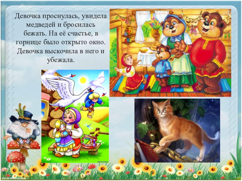 Слайд 14Девочка проснулась, увидела медведей и бросилась бежать. На её счастье, в